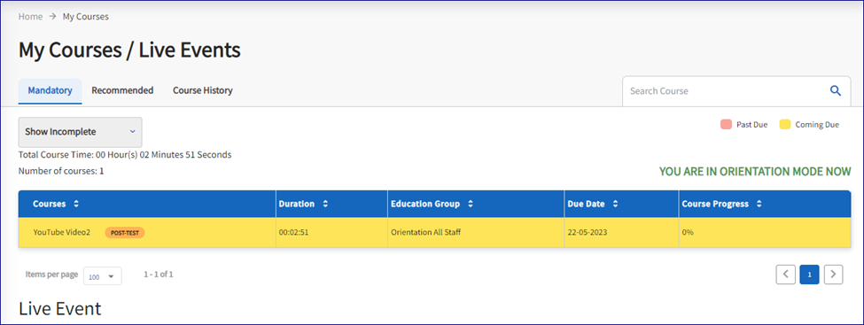 The tabs at the top of the screen allow you to filter the view. The default will show mandatory education. They can also view anything that has been recommended, and any courses they have already completed for the year. My Courses will also list any scheduled Live Events that are available for self registration.