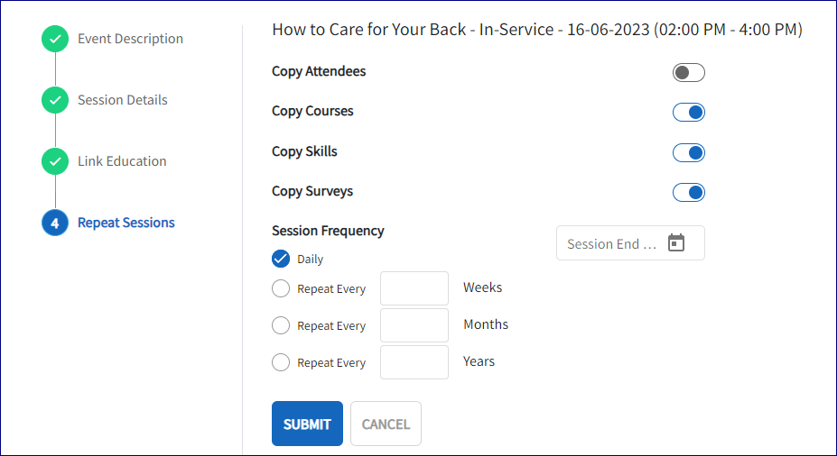 - Select the Courses and skills you would like associated with this event/session using the drop down arrows.