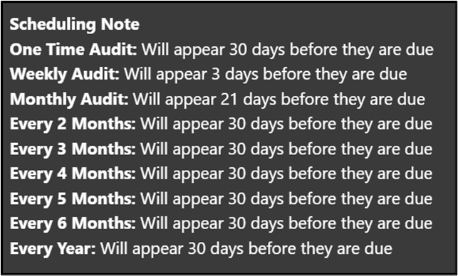 For example - a Weekly audit will appear 3 days before the due date of the assigned user dashboard.