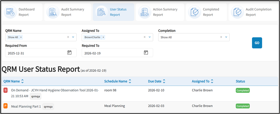 Within an individual’s profile, you can apply several filters to customize the data view. You can select multiple audits or users, and choose to display Completed, Not Completed, or All entries. You can also filter the data by different time periods.