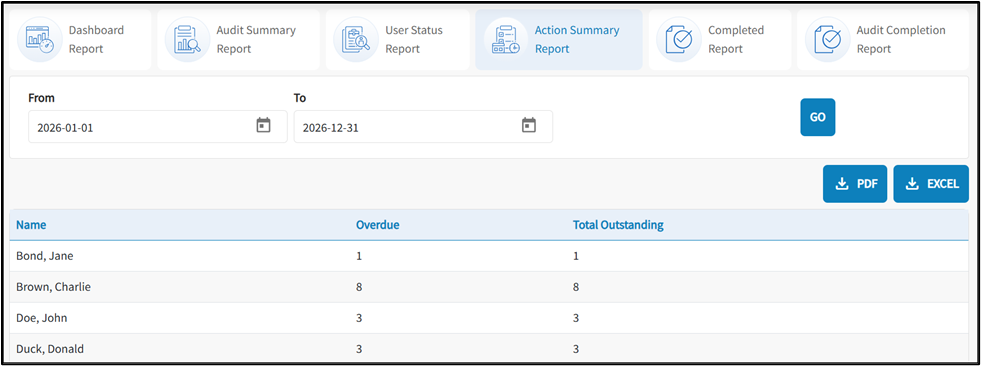 The Action Summary Report provides details on outstanding and overdue actions, including the individuals responsible for completing them.