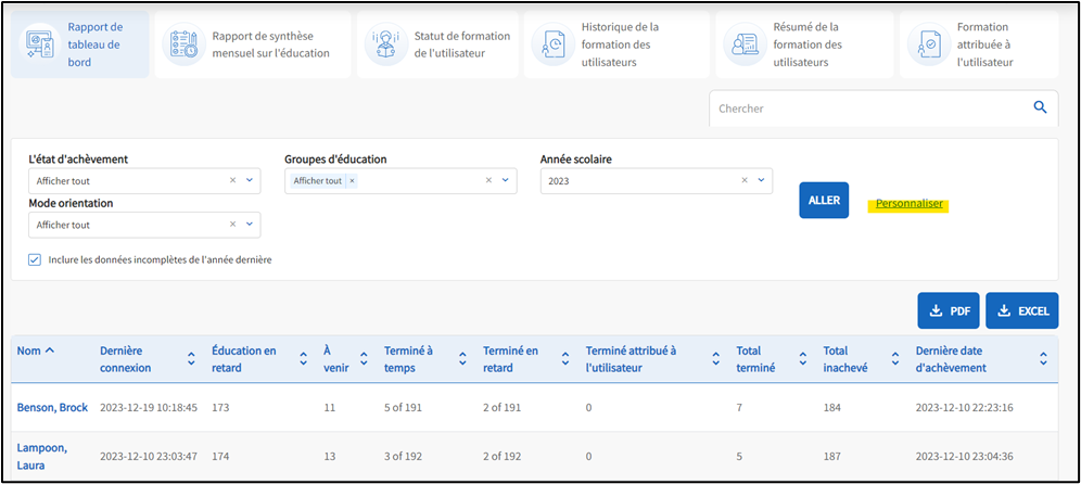 Le rapport du Tableau de bord fournit un aperçu de haut niveau de l'éducation du personnel. Comme il s'agit d'un rapport plus volumineux, vous pouvez personnaliser les colonnes et approfondir les informations. En cliquant sur le nom de l'employé, vous obtiendrez un hyperlien sur l'état de la formation de l'utilisateur.